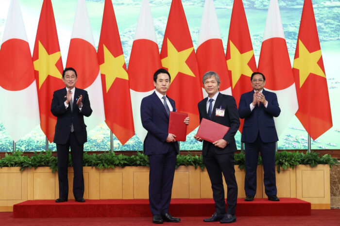 左:岸田首相 中央左:理事長 檀之上 中央右:ブイ・ティエン・フン先生 右:ファム・ミン・チン首相