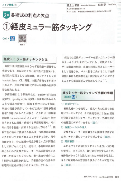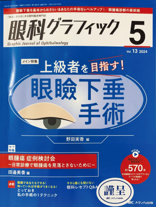 クリニックでも行う手術・治療(眼鏡処方を含む)特集に「各術式の利点と欠点/経皮ミュラー筋タッキング」についての記事を掲載しています。